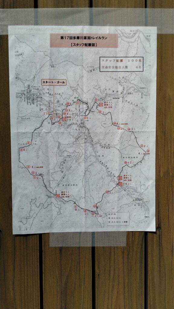 道の駅に設置されている会場に向かい、参加証のTシャツをゲット。配布場所の脇には、コース図が貼られており、総勢100名のスタッフが要所要所に配置されている様子が分かります。
