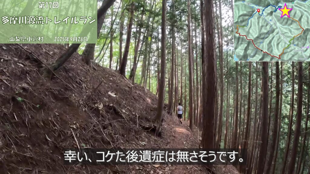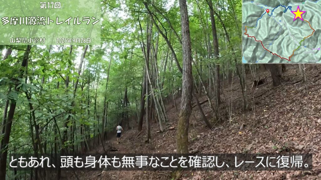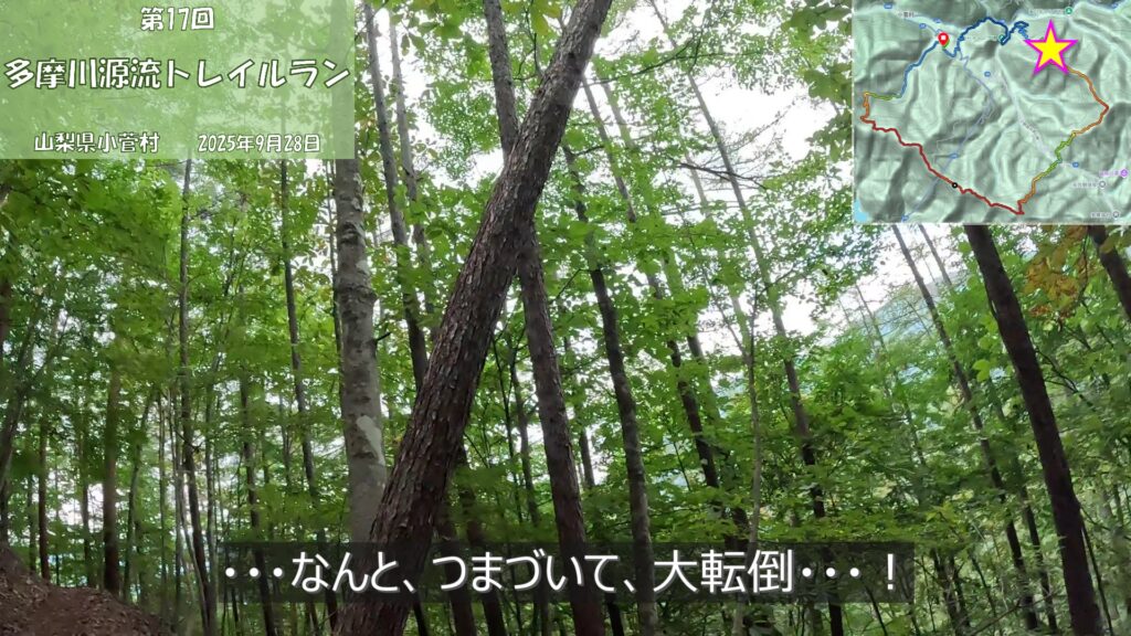 このコースの途中、思わぬところで転倒。幸い怪我もなく無事でした。大会からの案内通り、手袋などの装備で固めていたのが良かったようです。