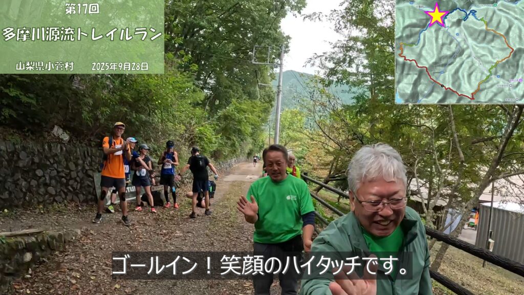 最後は、第3エイドのオマキ平登山口からゴールまでの様子です。残り約3km、舗装道もあるので楽ちんと思いきや、疲れ切っているせいか、なかなかゴールに辿り着かない最終盤でした。でも、ゴール時のハイタッチですべてが報われた感じでした。ゴール直後、最初のハイタッチは村長さんでした!