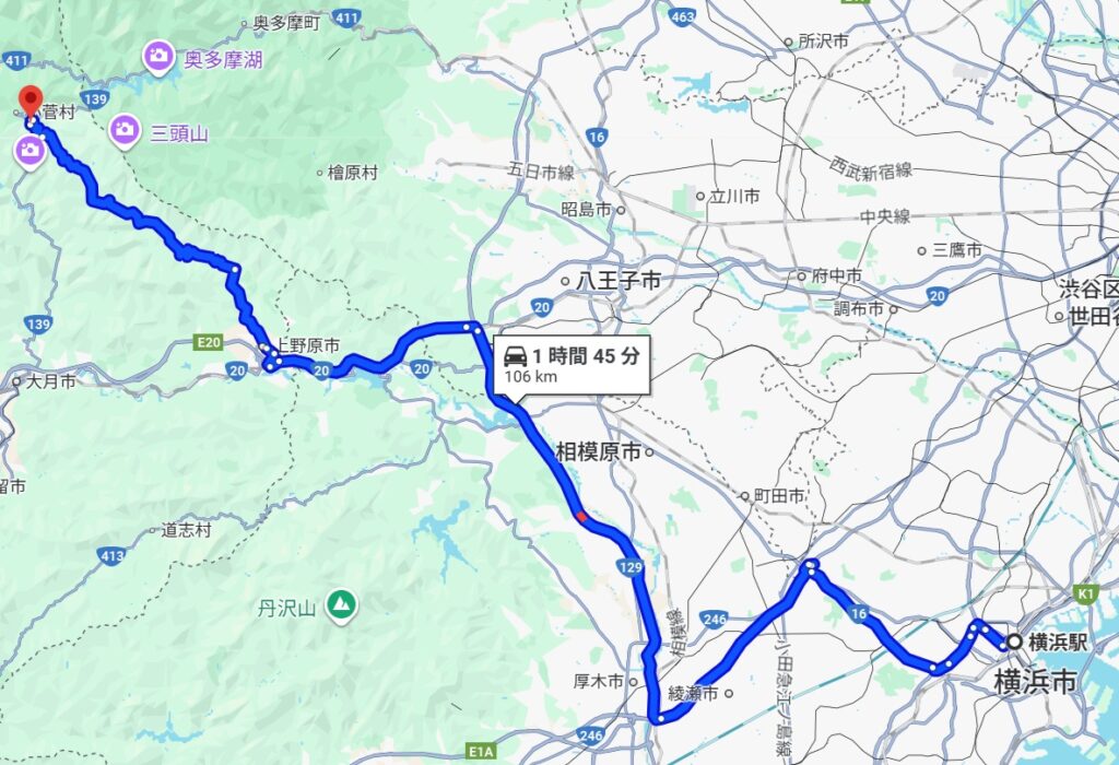 Googleマップの推奨ルートは、横浜町田ICから東名高速に入り、海老名JCTから圏央道へ、八王子JCTから中央道に入り、上野原ICを出て、小菅村に向かうというルート。渋滞もあって、所要時間は2時間半ほどかかりました。