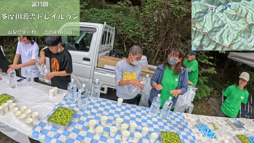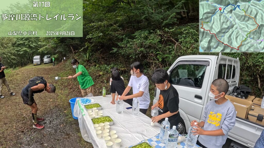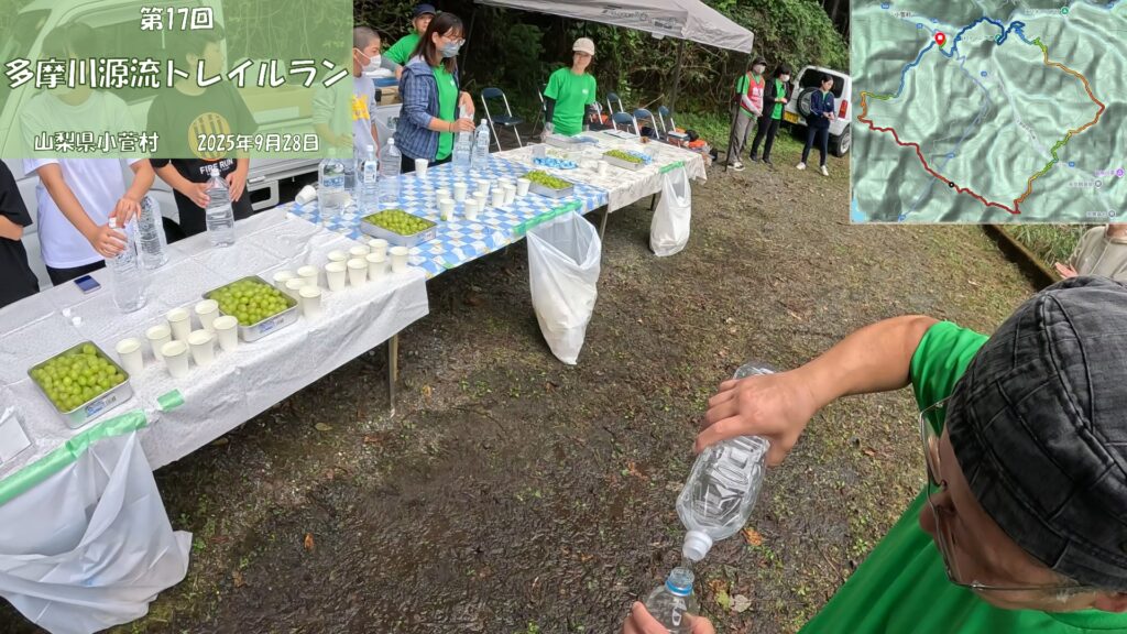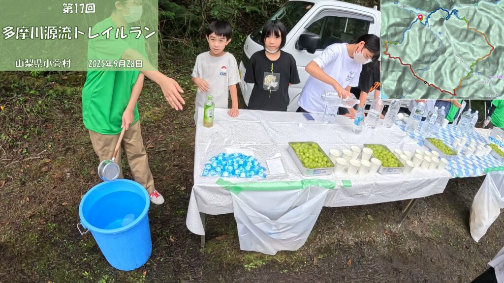 このエイドでは、シャインマスカットがお勧め。最終エイドということで、ランナーはかなり疲れている状態ですが、水の補給、かぶり水など、こまめに対応してくれました。また、子供たちも多いエイドで、笑顔が素敵なエイドでした。