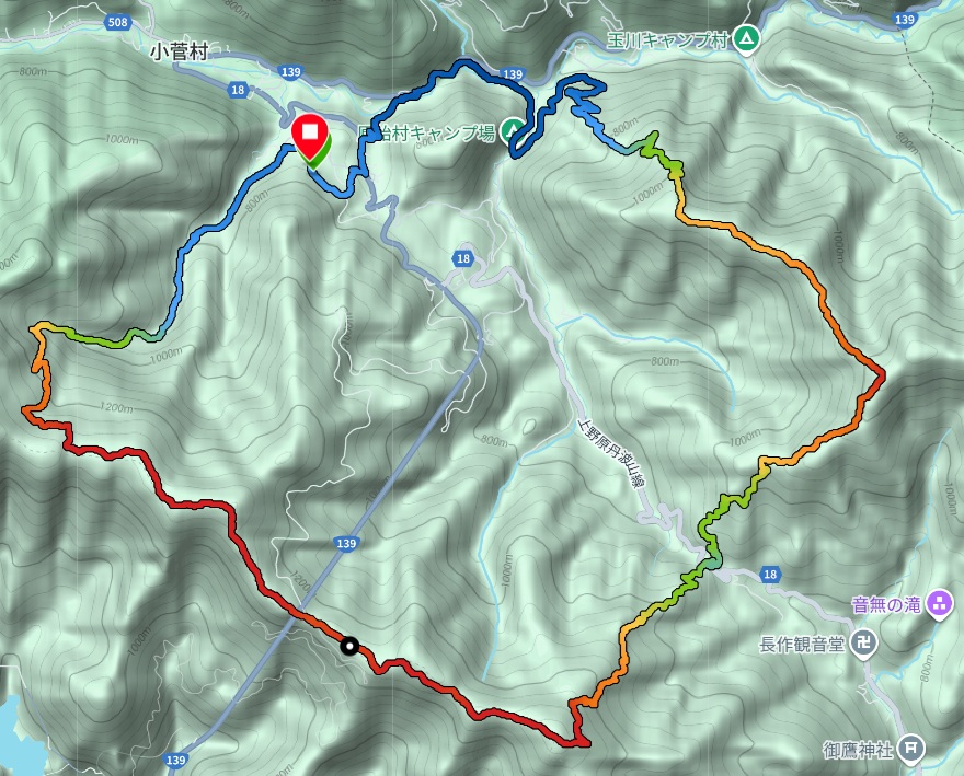 以下にGarmin Connectで作成されたGoogle Mapのコース地図を示します。色分けは標高を表しており、青、緑、黄、赤となるにつれて標高が高くなります。小菅村の中央部分、谷間にある盆地を取り囲む山々を、ぐるりと1周するコース設定です。